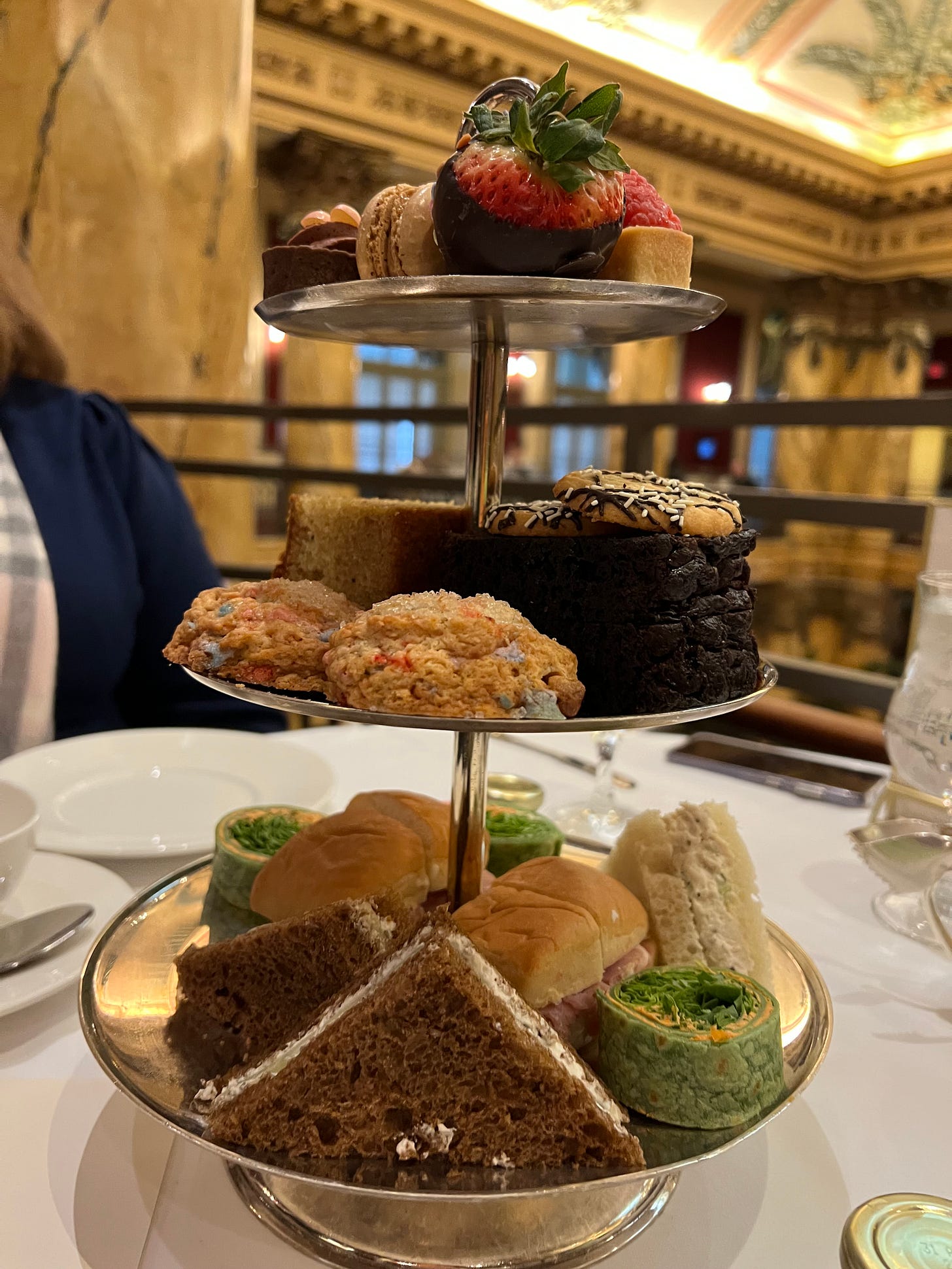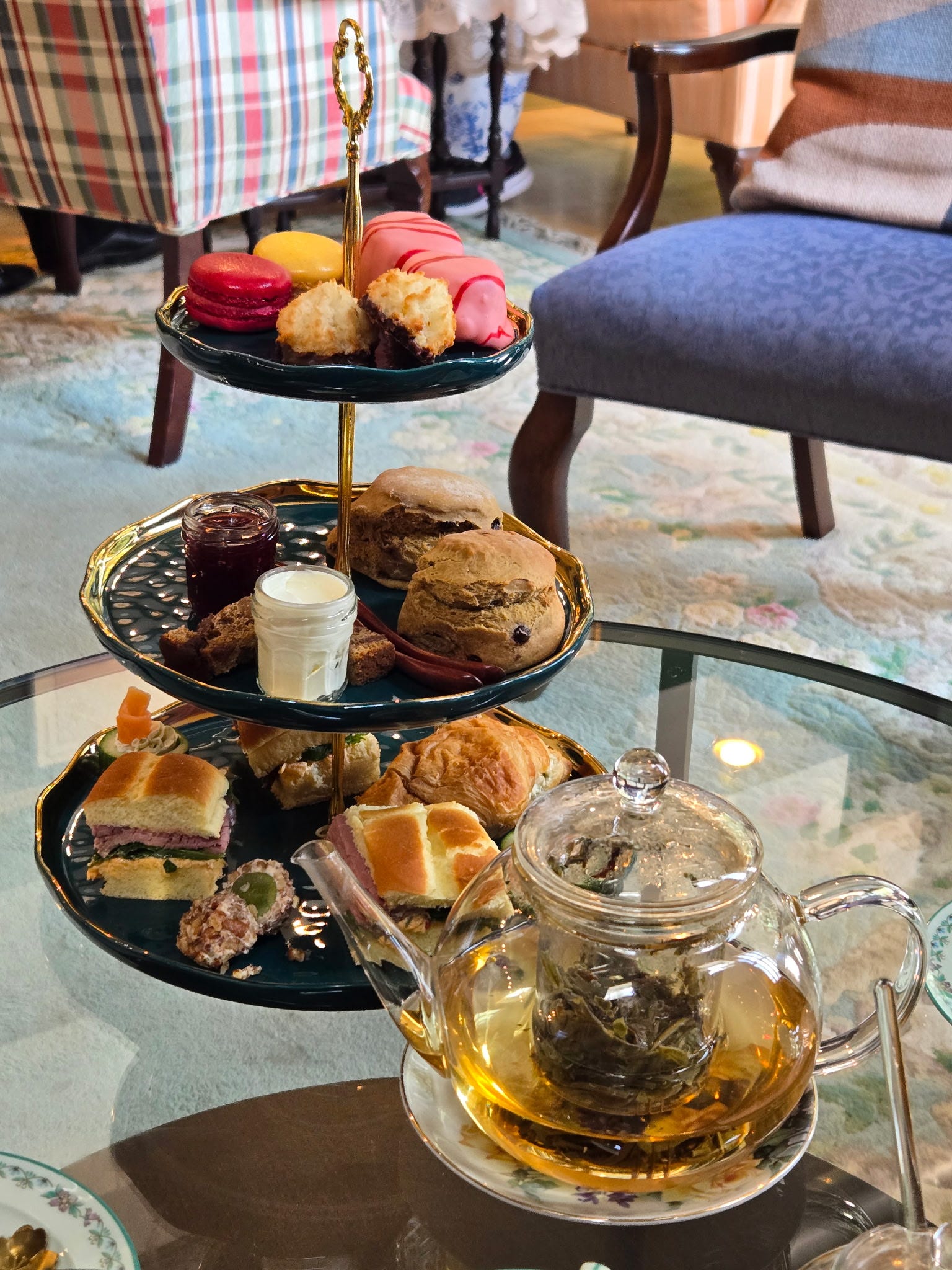 At both locations, the baked goods arrive beautifully arranged on a tiered stand — lovely in theory. I learned this year that proper etiquette suggests you don’t take an item directly from the stand. Instead, you’re supposed to lift the plate, bring it to your setting, select your item, and return the plate.